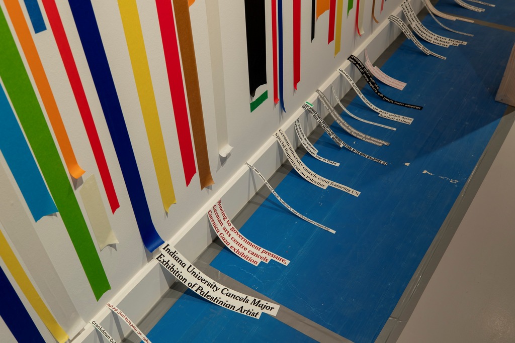 I thought I’d escape my fate (again) [J’ai cru échapper à mon destin (à nouveau)], aborde la notion polysémique du « refus » tant au sens large qu’à travers des expériences spécifiques. L’installation est le fruit d’une collaboration avec le graphiste Pierre Huyghebaert, qui enseigne à l’école d’art La Cambre à Bruxelles et dirige le studio Speculoos. Sa pratique consiste principalement à utiliser des logiciels libres pour repenser les processus collaboratifs dans les domaines de la cartographie, de la conception typographique, des interfaces web, de l’illustration schématique et de la conception de livres. Le projet rassemble les déclarations de personnes ayant annulé des expositions artistiques, des conférences et des concerts liés à la Palestine, ainsi que les témoignages de celles et ceux dont les événements ont été annulés. Les citations superposées et floues, en anglais, français, arabe et allemand, créent un effet abstrait, tridimensionnel, presque illisible. Ce flou intentionnel sert de métacommentaire sur le refus lui-même, tout en soulignant l’utilisation institutionnelle du texte comme mécanisme de pouvoir et de contrôle. I thought I’d escape my fate (again) invite les spectateur·rices à réfléchir au refus à la fois comme un acte visible de dissidence et comme une forme subtile de répression au sein des institutions culturelles.
